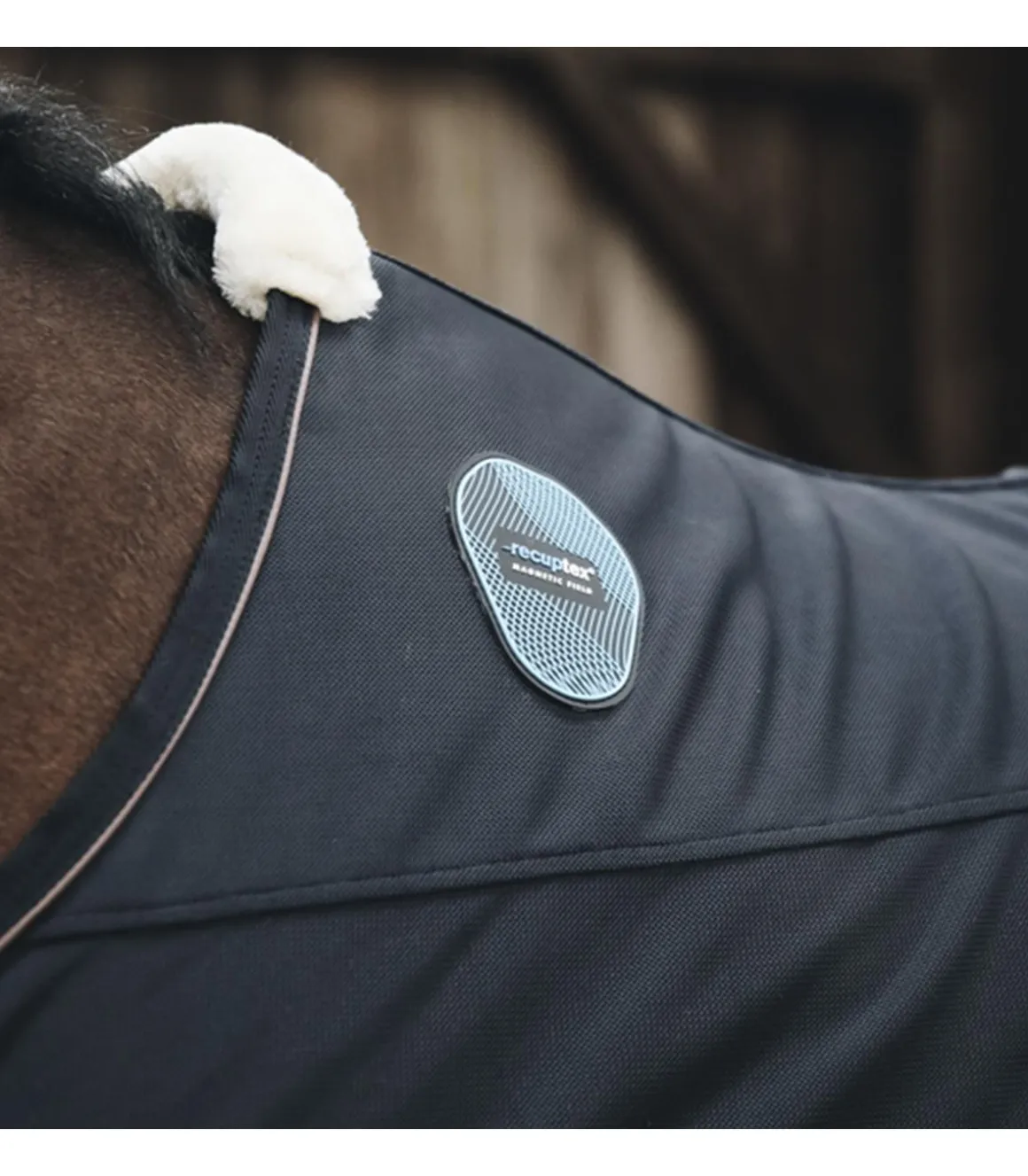 Basée sur la technologie Bekinox de Bekaert, la couverture contient un fil inox très fin qui est tissé dans le tissu. Ce fil crée une cage de Faraday qui reflète les champs magnétiques créés dans le corps du cheval.