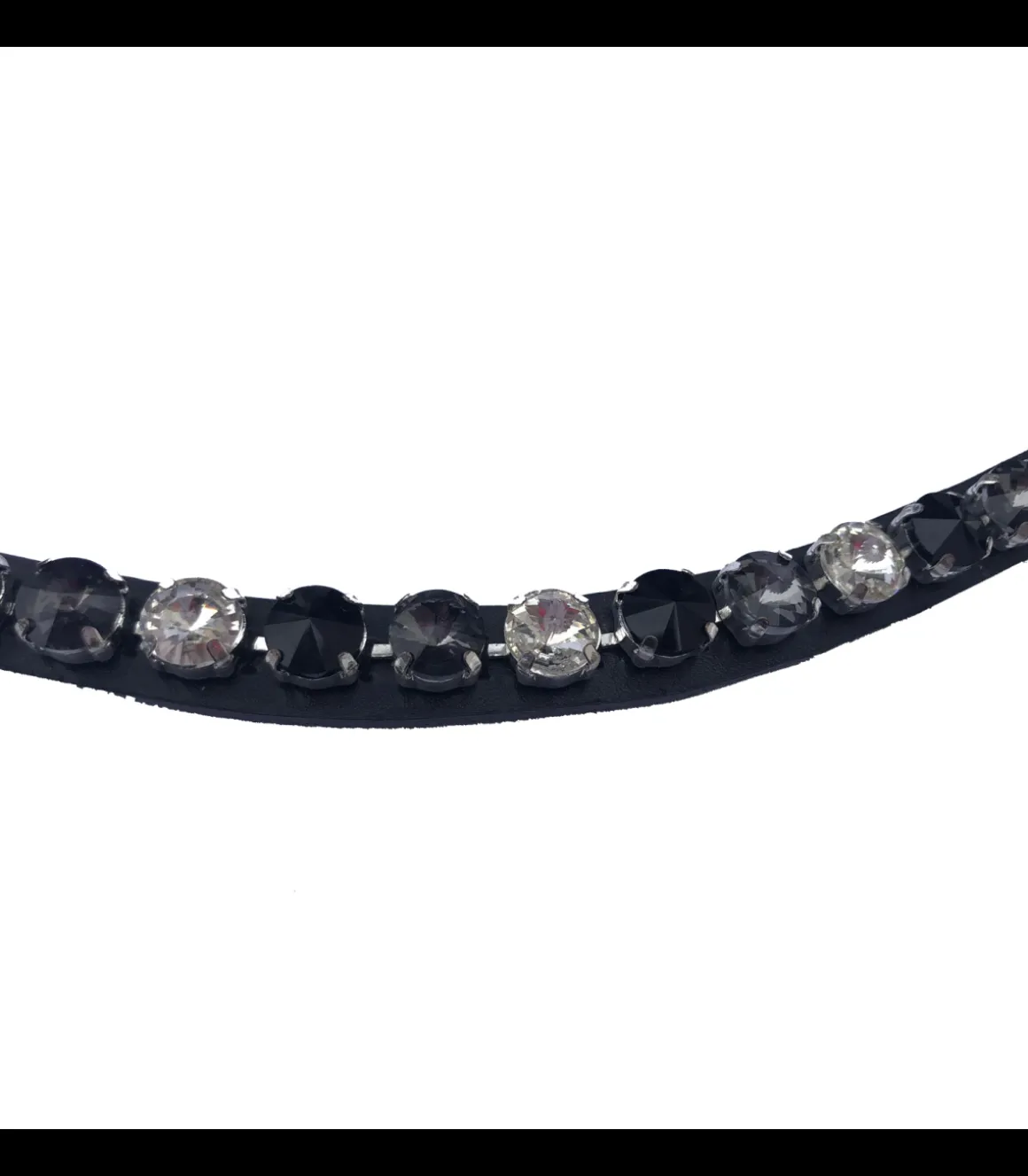 Le frontal Rockstar de chez JMR Pro est un frontal en cuir décoré de gros strass noir/gris/argenté. Ce frontal est en cuir souple.
