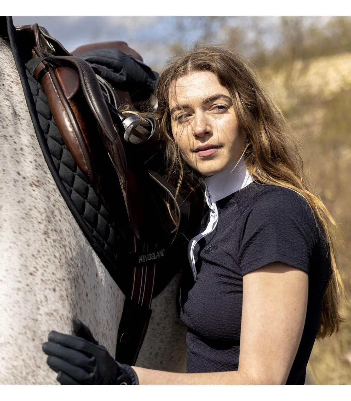 >Le col et la fermeture sont en tissu tissé et comportent un bouton en métal avec le logo. Le tissu a une belle texture avec des empiècements lisses sur les côtés