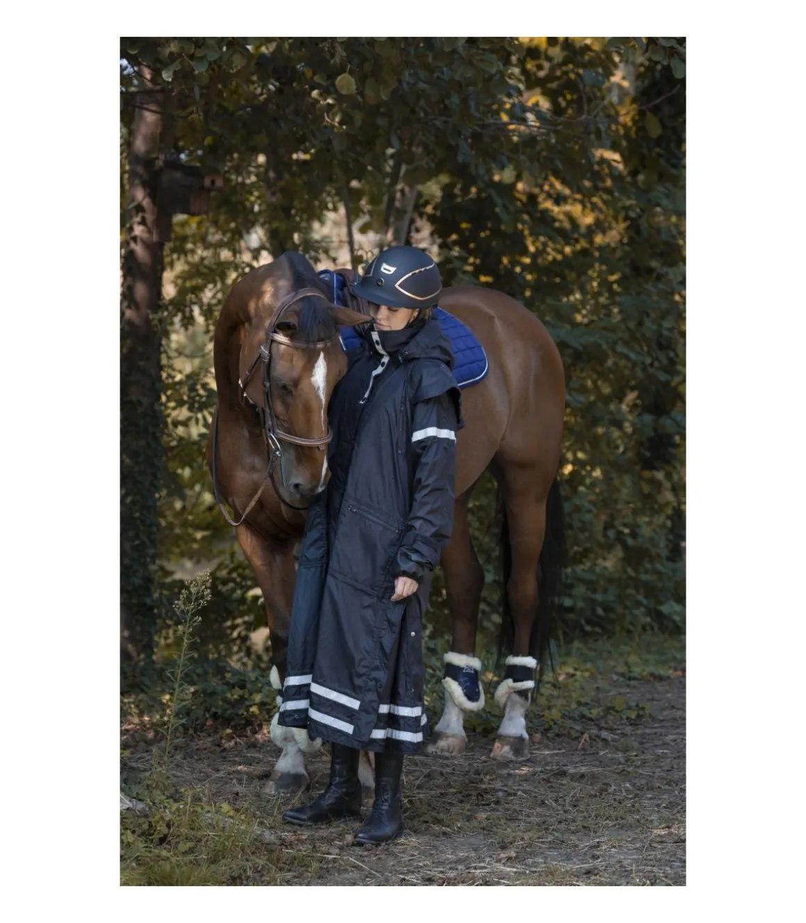 Grâce à une capacité d’imperméabilité de 3000 mm, une membrane respirante 3000 g/m²/24h et des coutures thermo-soudées, le RiderCoat offre une protection efficace contre la pluie tout en évacuant la transpiration. La fermeture éclair frontale étanche double sens, protégée par un rabat boutonné, renforce encore l’étanchéité et le confort à cheval.