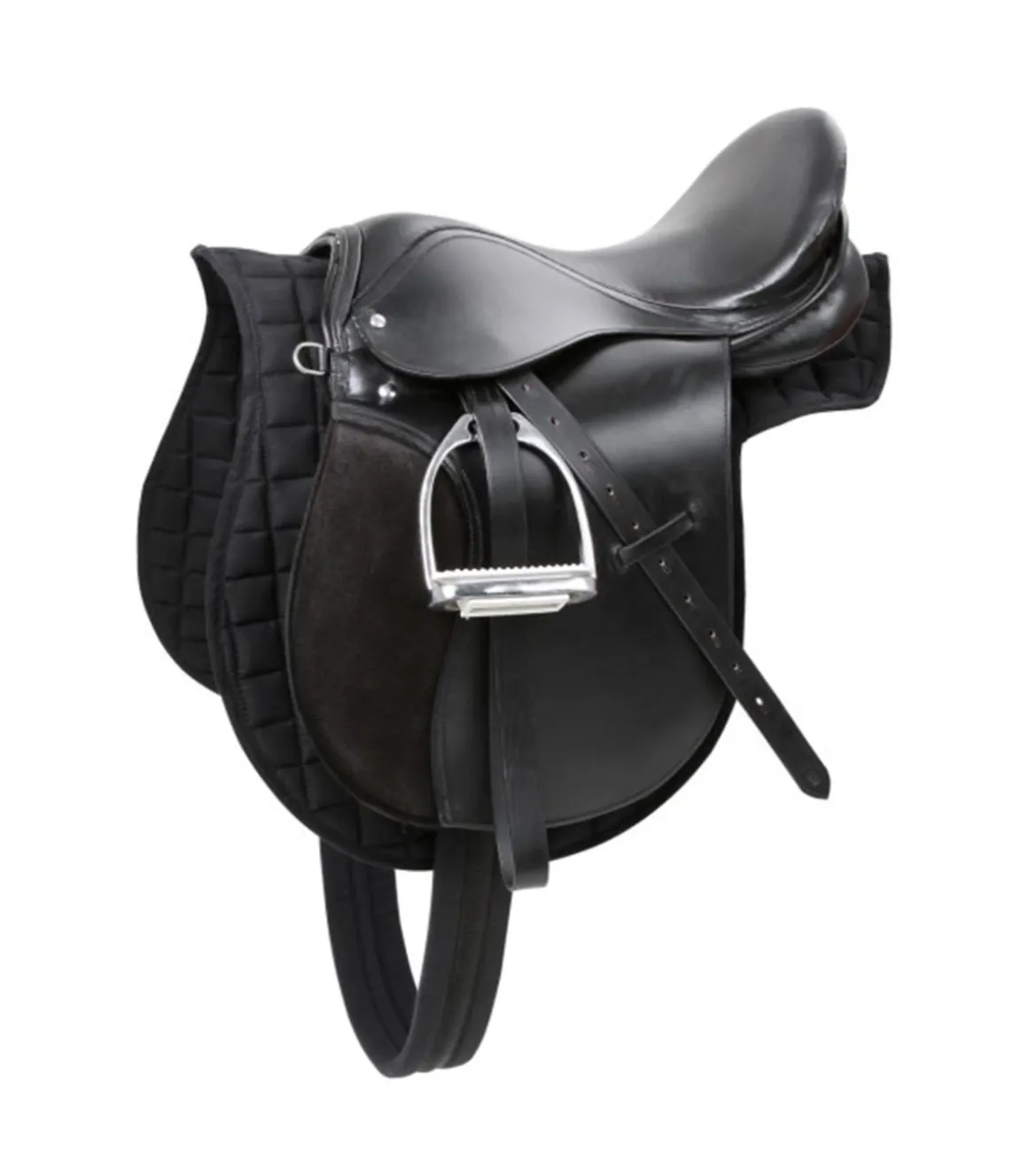 Le kit de selle comprend une selle mixte en 17,5 » (avec ouverture d’arcade de 34,5cm) , un tapis de selle (forme de selle), des étrivières, une paire d’étriers et une sangle 125 cm.