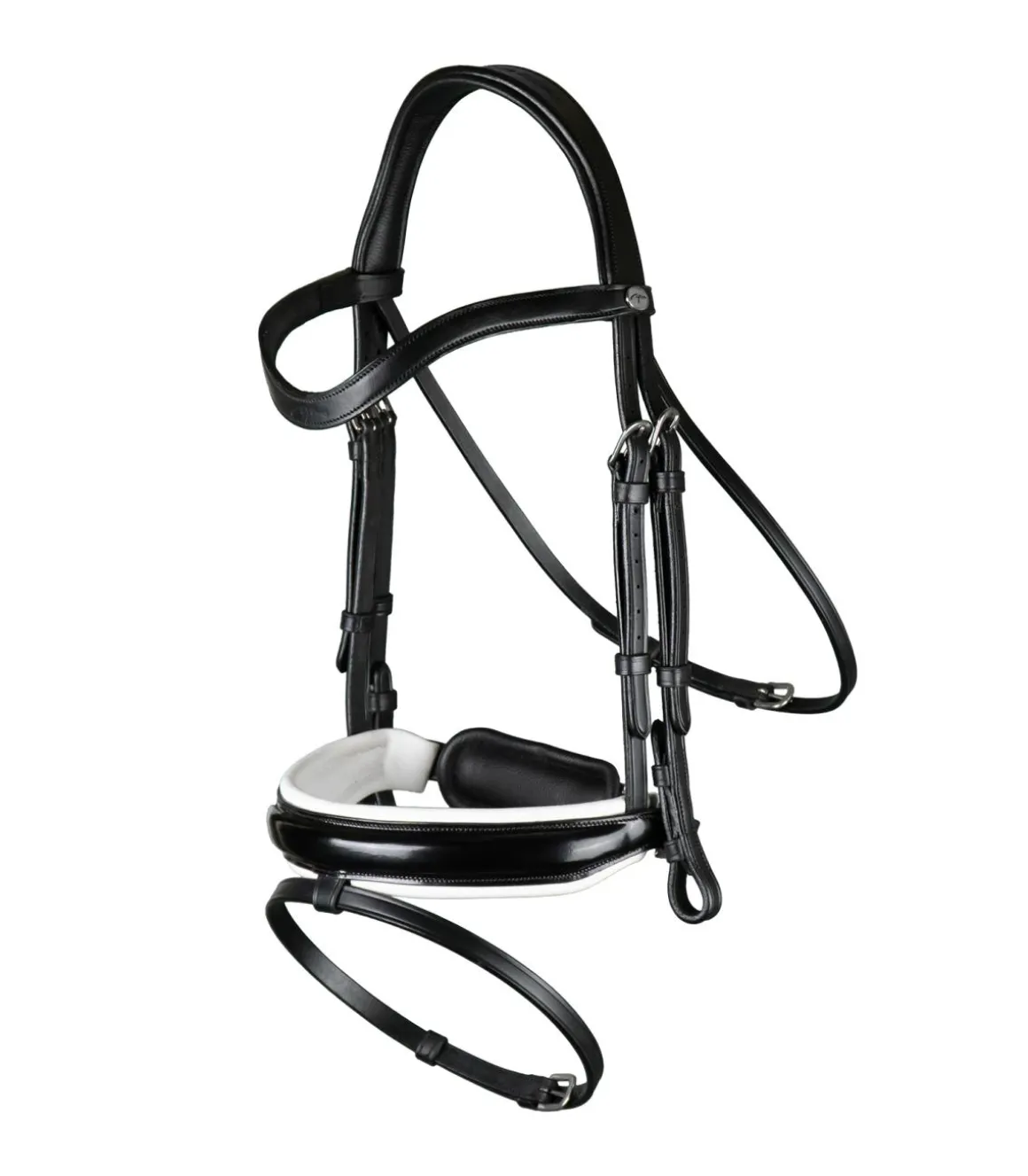 La muserolle est large, vernie à l’avant, doublée à l’intérieur en blanc et, avec une fermeture pull back.