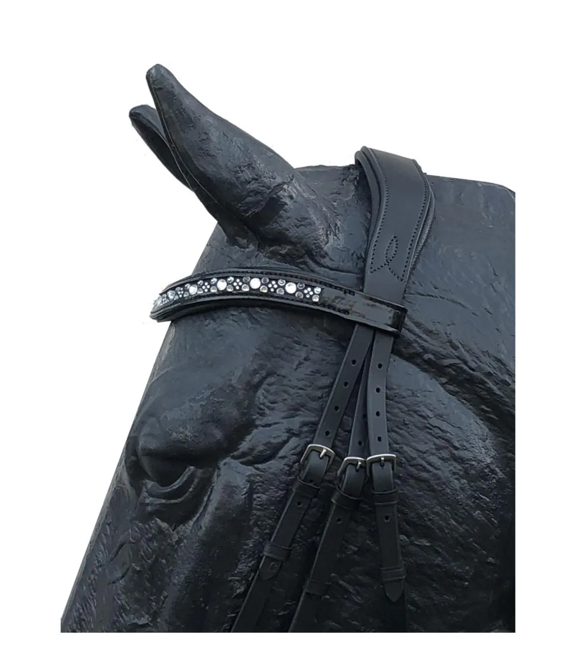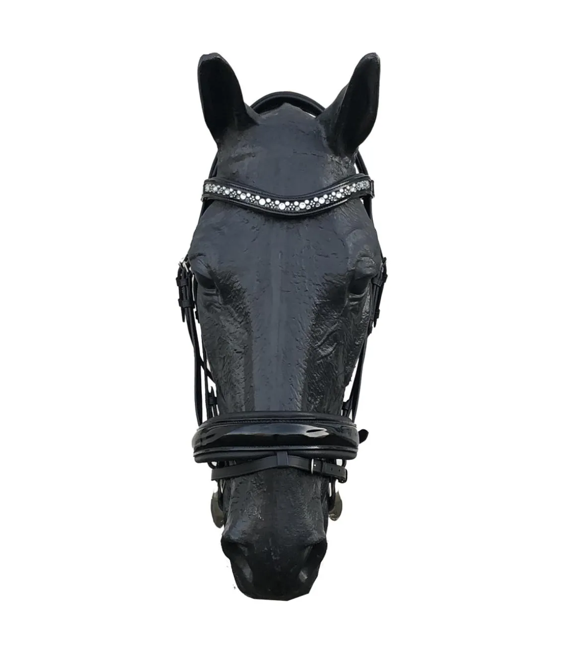 Le frontal est en forme de V léger est décoré de strass blanches, grises et noirs.