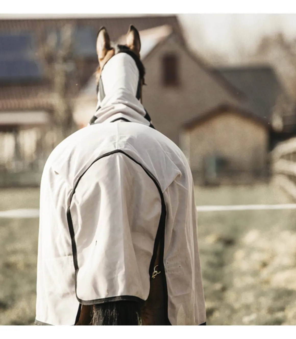 La couverture anti-mouches est de forme anatomique pour rester dans la bonne position, même après avoir que le cheval se soit roulé.