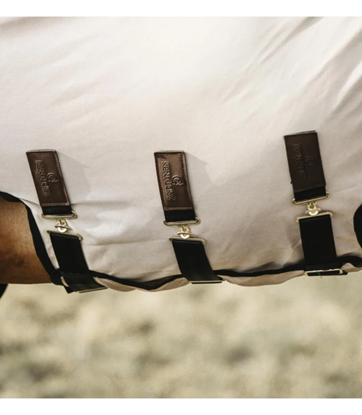 Pour protéger la zone du ventre, la couverture comporte un rabat ventral. Ce rabat est fermé par une fermeture autoagrippante et 3 sursangles droites. Comme la couverture ventrale est proche du ventre du cheval, vous évitez que les insectes ne rentrent par les côtés.