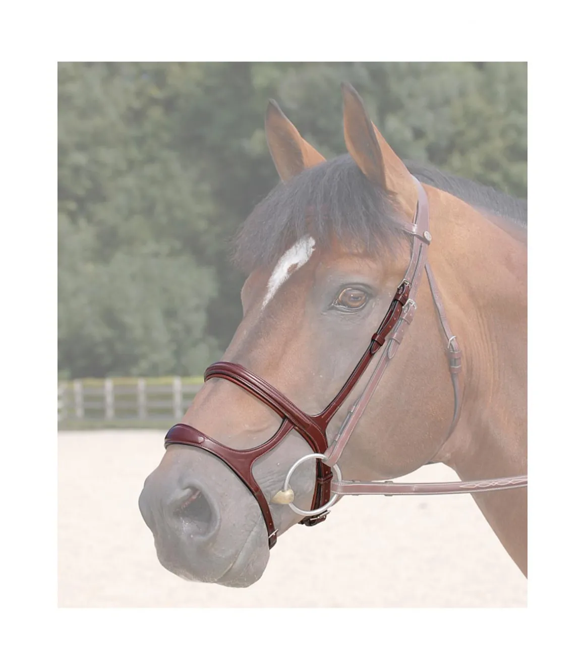 Elle un double effet , celui de combiné une muserolle française et une muserolle allemande. La combinaison des deux muserolles permet de gérer complètement l’ouverture de la bouche, les montants latéraux joignant les 2 parties limitent le décalalge des mâchoires.