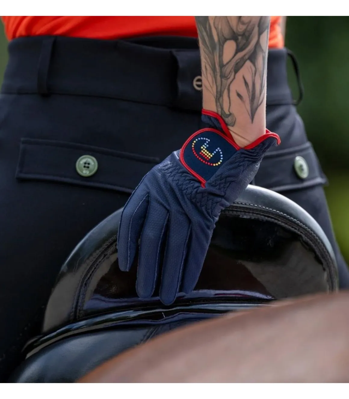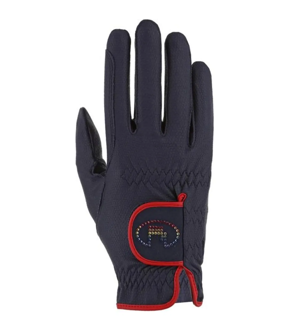 L’élégant bleu marine, le rouge tuck et le blanc classique rencontrent un logo Roeckl Sports fait à la main avec de précieux cristaux Swarovski aux couleurs de l’arc-en-ciel.