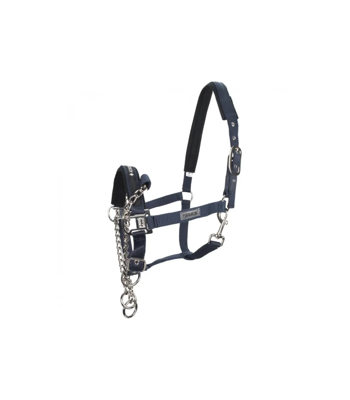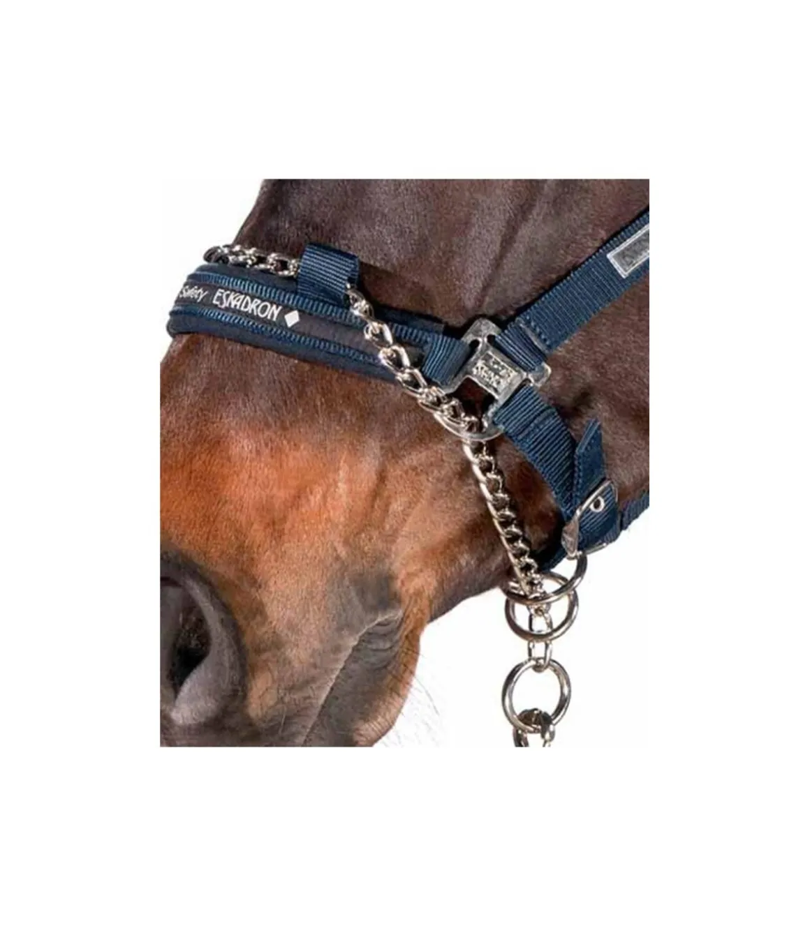 La muserolle de ce licol est équipée d’une chaîne qui a pour but une action éducative et plus efficace.