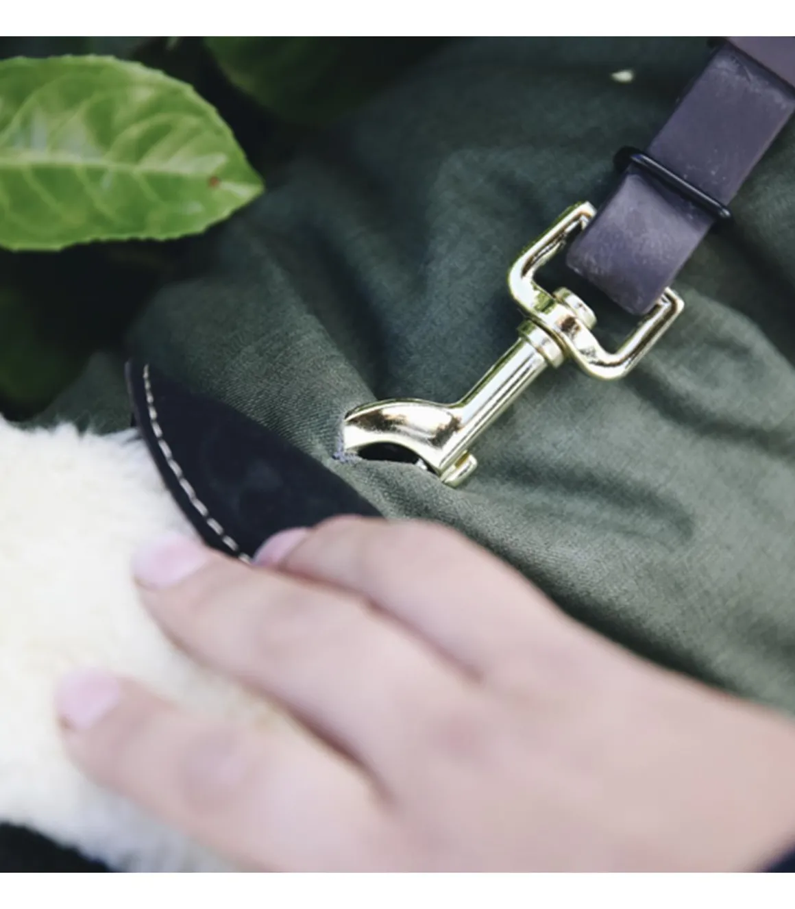Sous la capuche se trouve un petit rabat en cuir artificiel. Sous ce dernier se trouve un petit trou qui vous permet d’y passer la laisse.