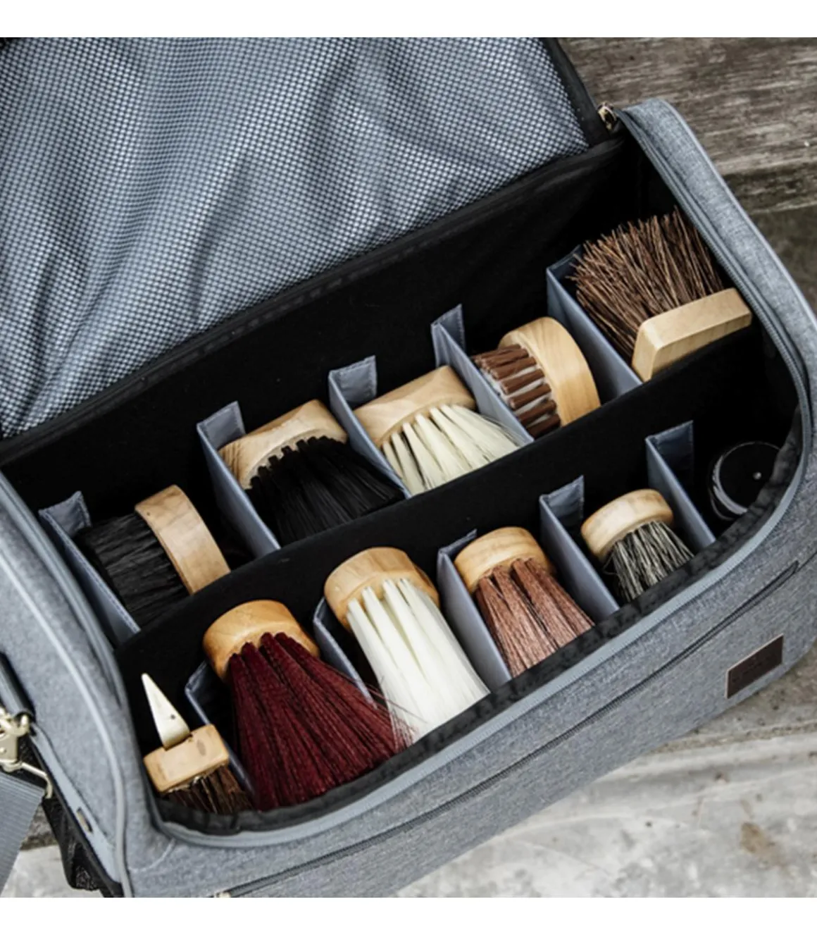 L’intérieur est ajustable grâce à des séparateurs à une fermeture autoagrippante. Ainsi, vous pouvez arranger le sac comme vous le souhaitez. Le compartiment principal vous permet de ranger vos brosses, vaporisateurs et autres accessoires de toilettage. À l’intérieur du rabat, une poche séparée permet de ranger les petits objets. Sur le devant se trouve un grand compartiment qui peut contenir des articles tels que des élastiques, du fil et une aiguille. Des deux côtés, vous trouverez une poche en filet extensible. Le sac de pansage est fermé par une fermeture éclair solide et dispose d’une sangle amovible avec rembourrage d’épaule pour un voyage facile et confortable. Le sac est renforcé sur le côté, ce qui lui confère une résistance supplémentaire et offre une meilleure protection aux brosses. Les dimensions du sac de toilettage sont 42,5 cm x 32,5 cm x 20 cm (L x H x L).